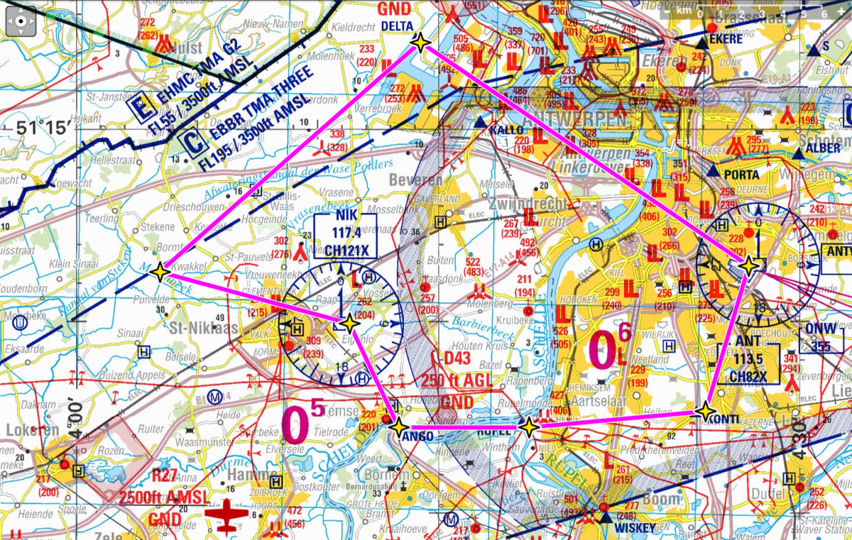 Deze route brengt je naar Sint-Pauwels, Sint-Niklaas, Temse en daar gaan we terug het gecontroleerde luchtruim van Antwerpen binnen om te landen.