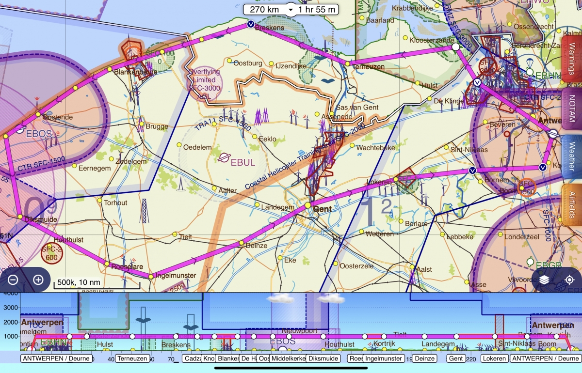 We vertrekken op de luchthaven van Antwerpen en overvliegen de Haven van Antwerpen en duiken Nederland binnen. Het Verdronken Land van Saeftinghe is ongelooflijk prachtig om vanuit de lucht te aanschouwen met al zijn natuurlijke aders die dit mooie natuurgebeid doorwateren. het is werkelijk adembenemend mooi. Via Terneuzen, Breskens en Cadzand komen we België opnieuw binnen langs het Zwin en Knokke. Langs de Belgische kustlijn passeren we Blankenberge, De Haan, Oostende, Middelkerke. Dan gaan we terug het binnenland in en passeren langs Diksmuide, Roeselare, Ingelmunster, Deinze, Gent, Lokeren en via Temse komen we terug het luchtruim van Antwerpen binnen. Deze vlucht duurt meer dan 2 uur en dat is wel even. Wanneer er veel wind staat kan het iets langer duren en maken we een tussenstop in Kortijk.